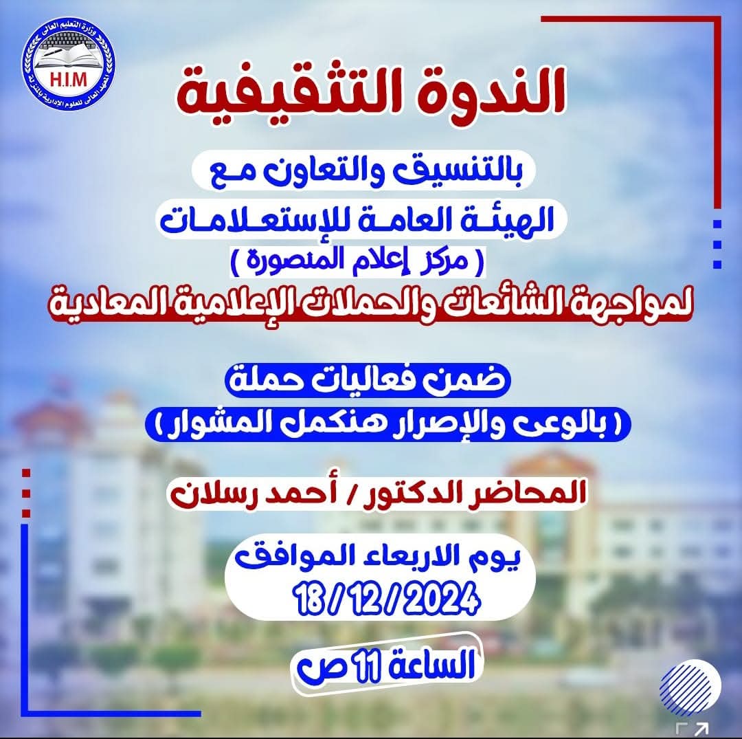 🔻 تتشرف إدارة المعهد العالي للعلوم الإدارية بالمنزلة التابع لجمعية شمال الدقهلية للتنمية البشرية والنهوض بالمجتمع بدعوتكم لحضور ندوة تثقيفية لمجابهة الشائعات والحملات الإعلامية المعادية