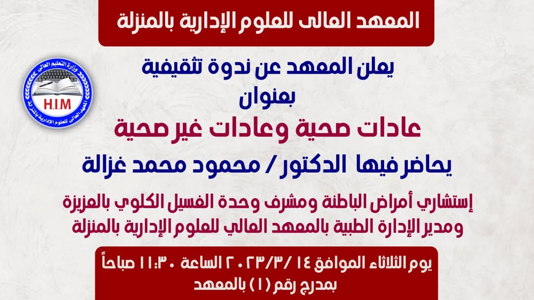 يعلن قسم رعاية الشباب بالمعهد عن إقامة ندوة تثقيفية بعنوان (عادات صحية وعادات غير صحية)