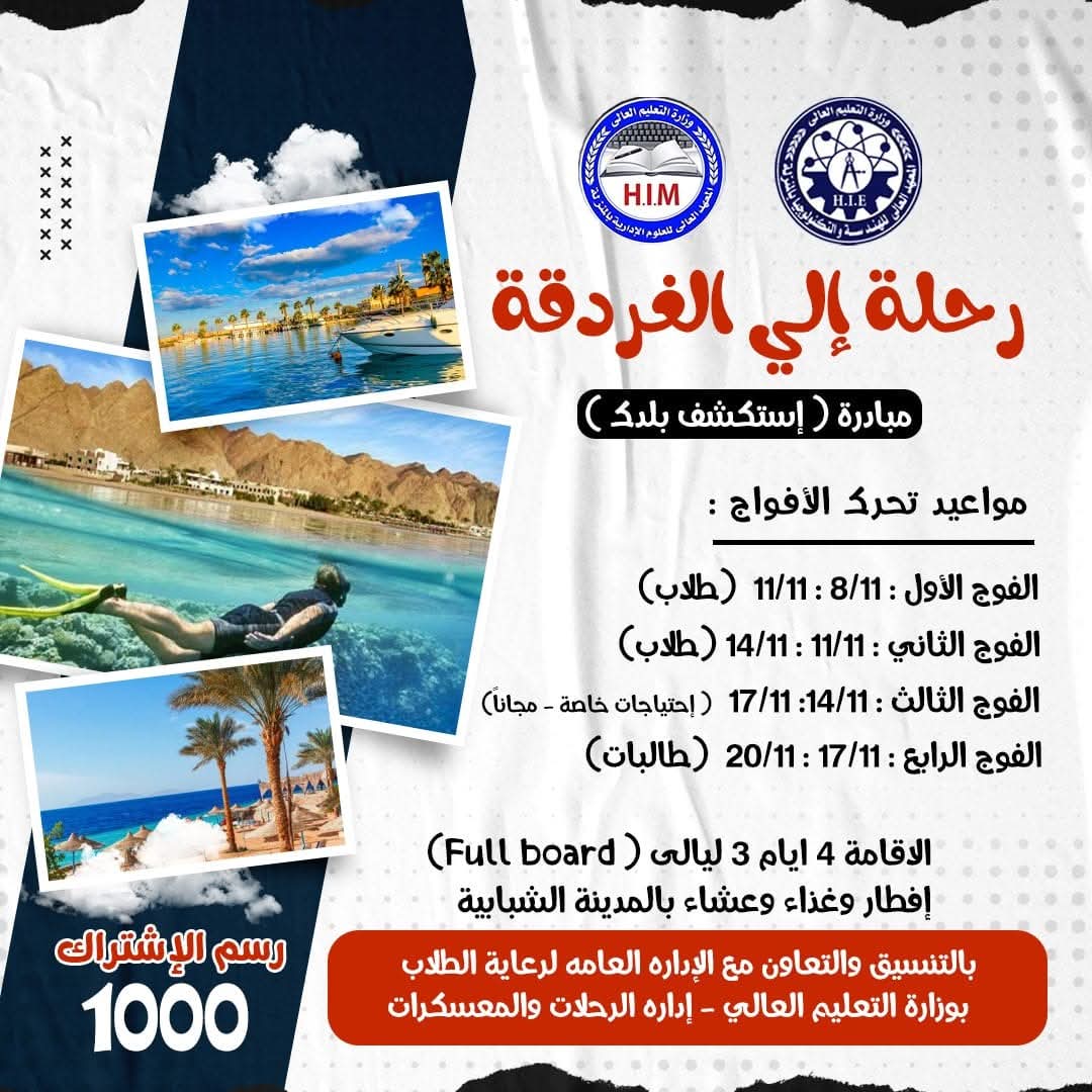 👈 تعلن إدارة رعاية الطلاب بالمعهد بالتعاون مع الإدارة العامة لرعاية الطلاب بوزارة التعليم العالى ( إدارة الرحلات والمعسكرات ) .