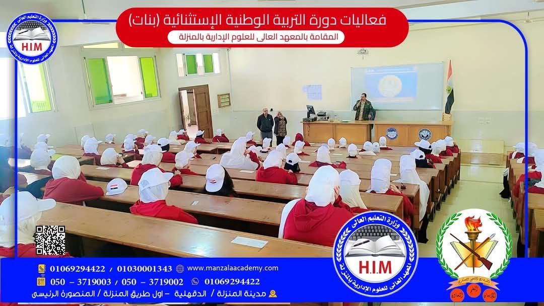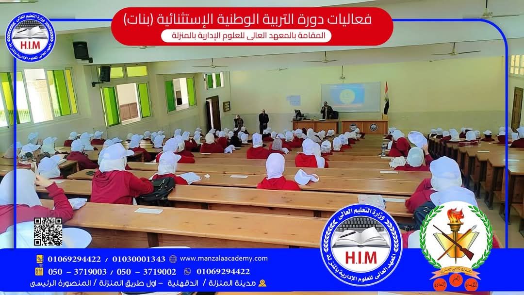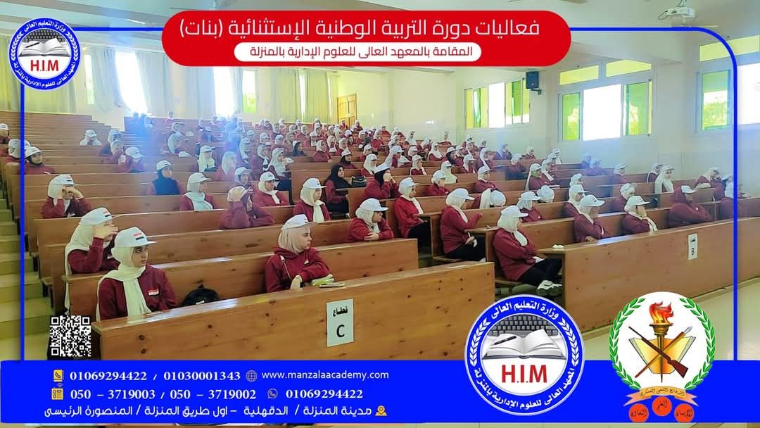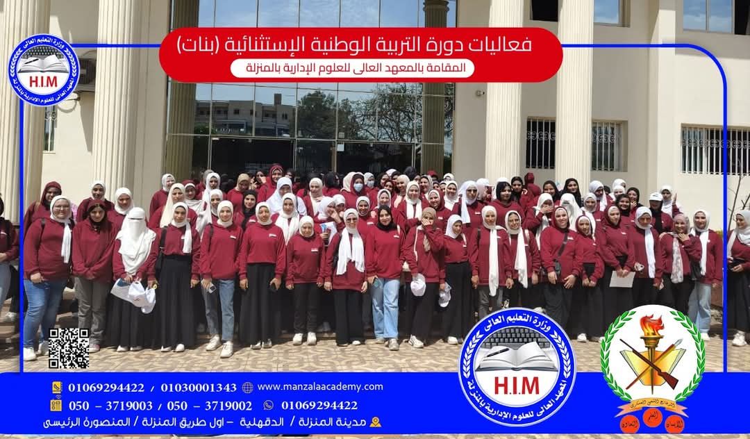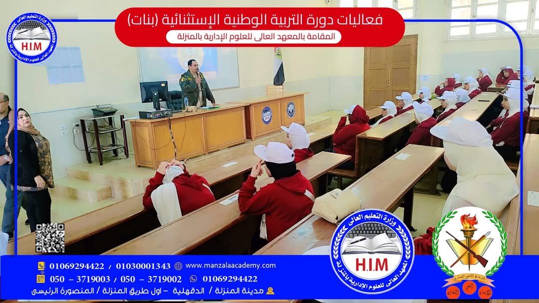 جانب من فعاليات دورة التربية العسكرية التي أُقيمت بـالمعهد العالي للعلوم الإدارية بالمنزلة خلال الأسبوعين الماضيين، والتي شهدت مشاركة متميزة من طالباتنا والتزامًا بروح الانضباط والانتماء الوطني. 🇪🇬💪